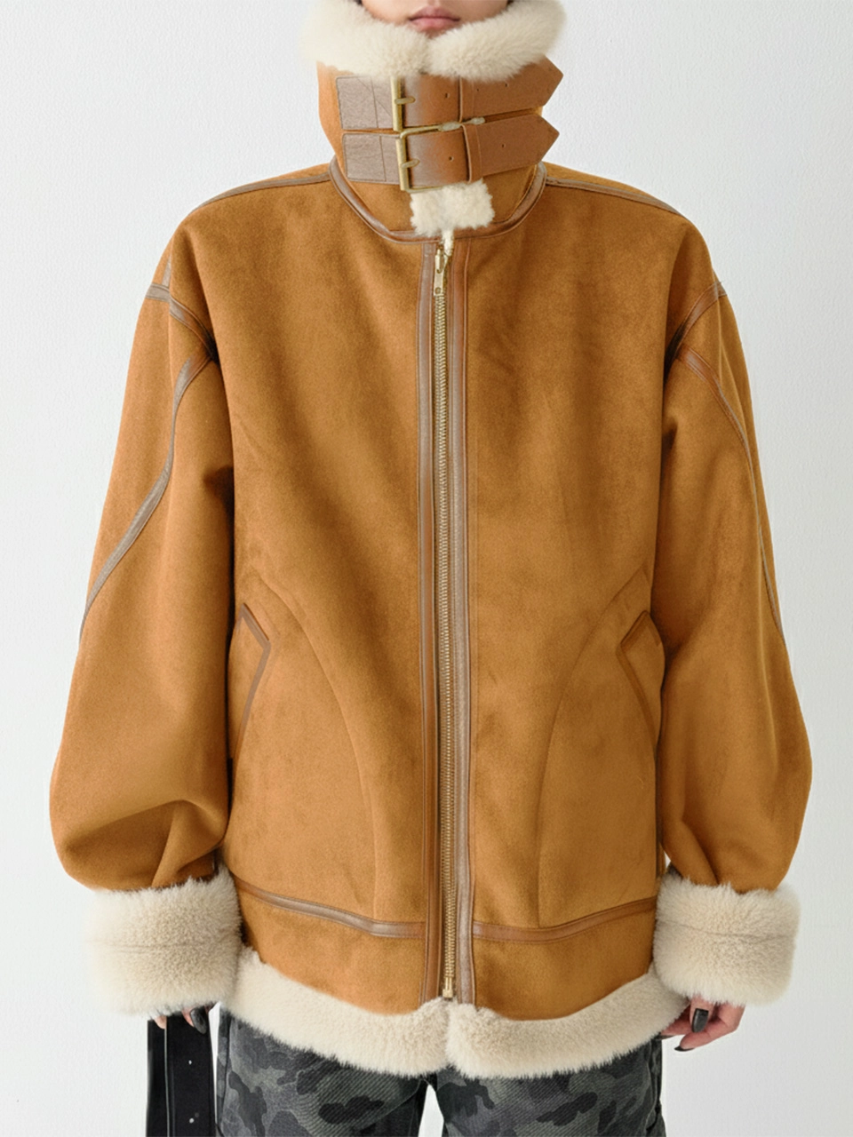 더그린랩_FAUX 레더 오버사이즈 벨슬리브 무스탕 [Suede Camel]
