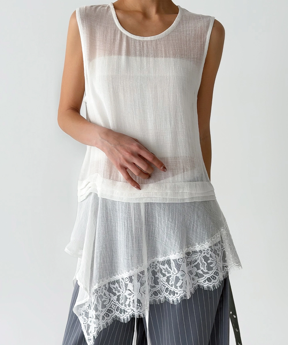 더그린랩_페미닌 언발 레이스 시스루 탑 [White]