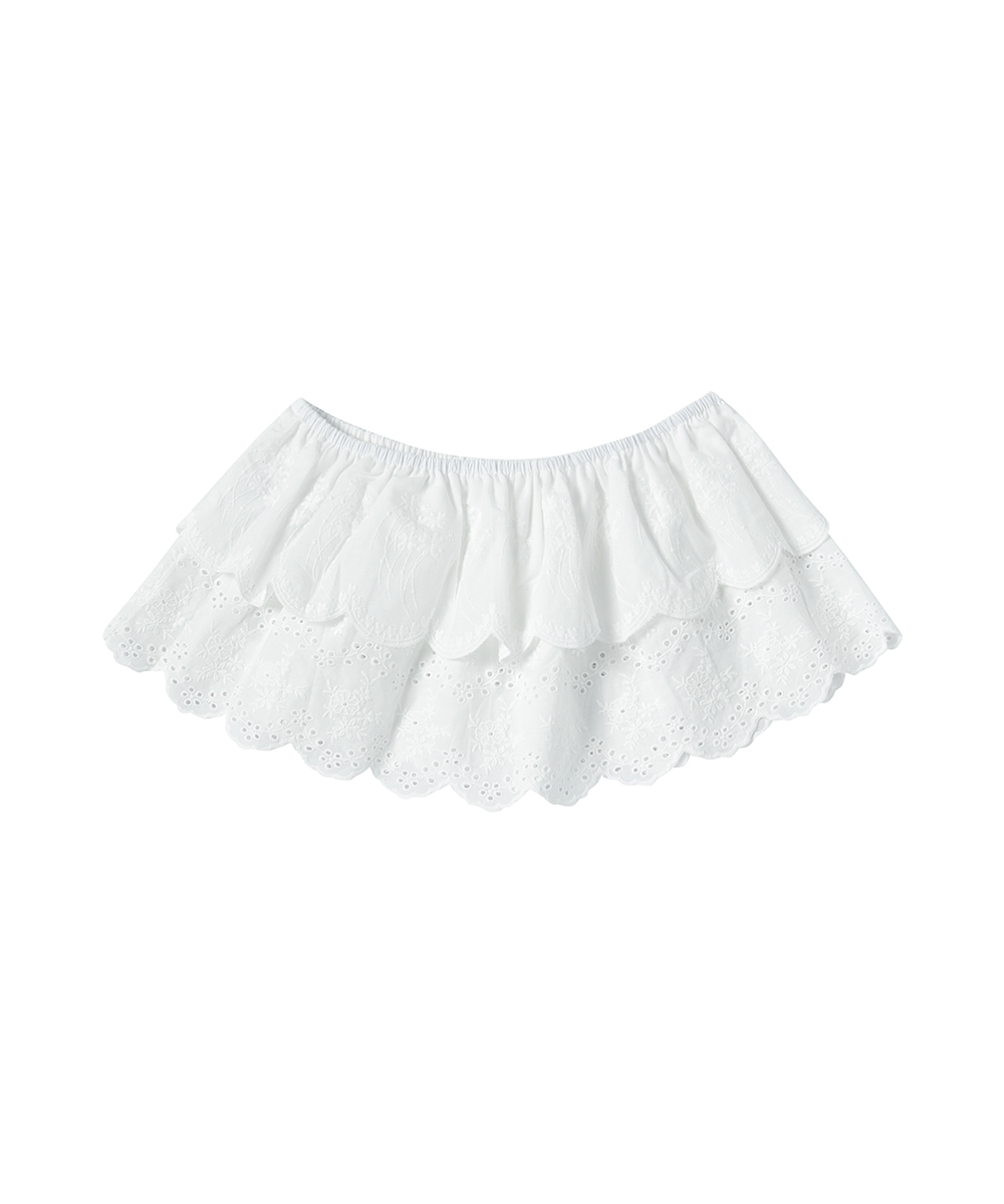 큐트한 무드의 펀칭 레이스 패턴이 돋보이는 미니 랩스커트
