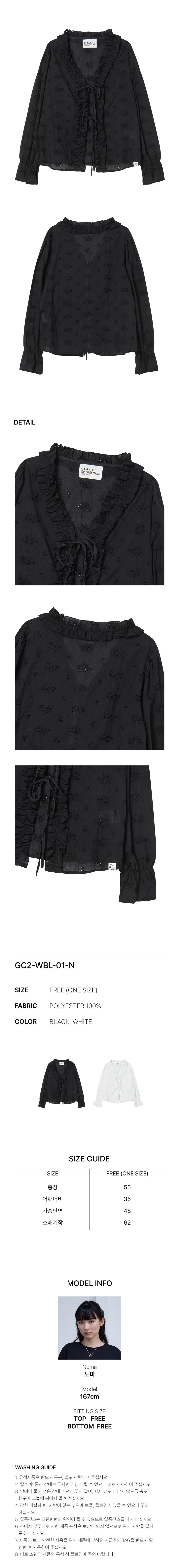 넥 라인을 따라 흐르는 프릴 트리밍이 페미닌한 무드를 강조