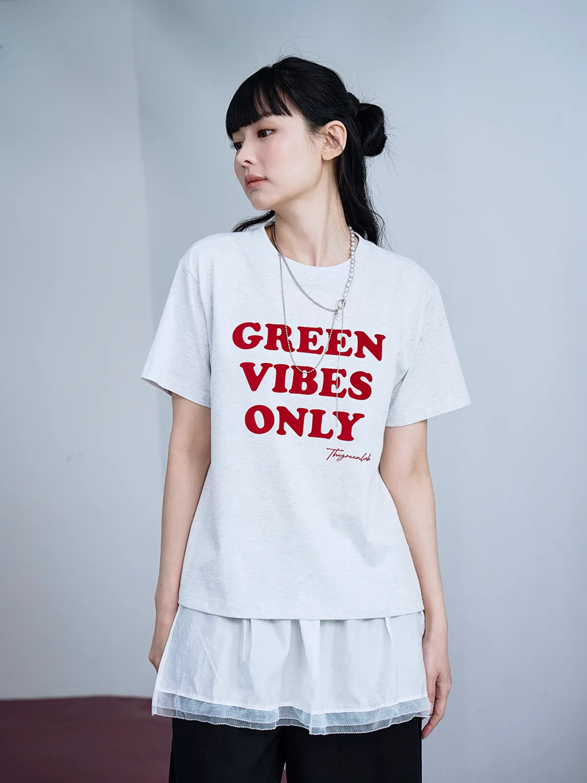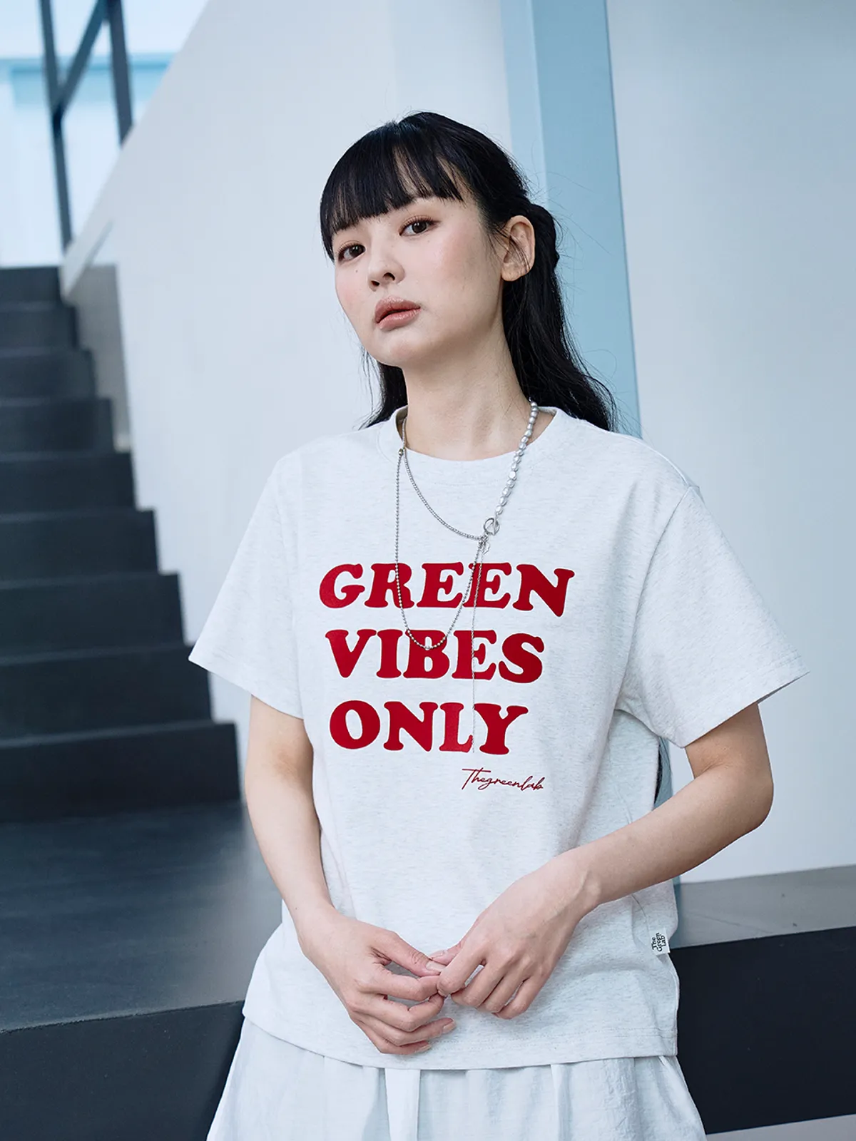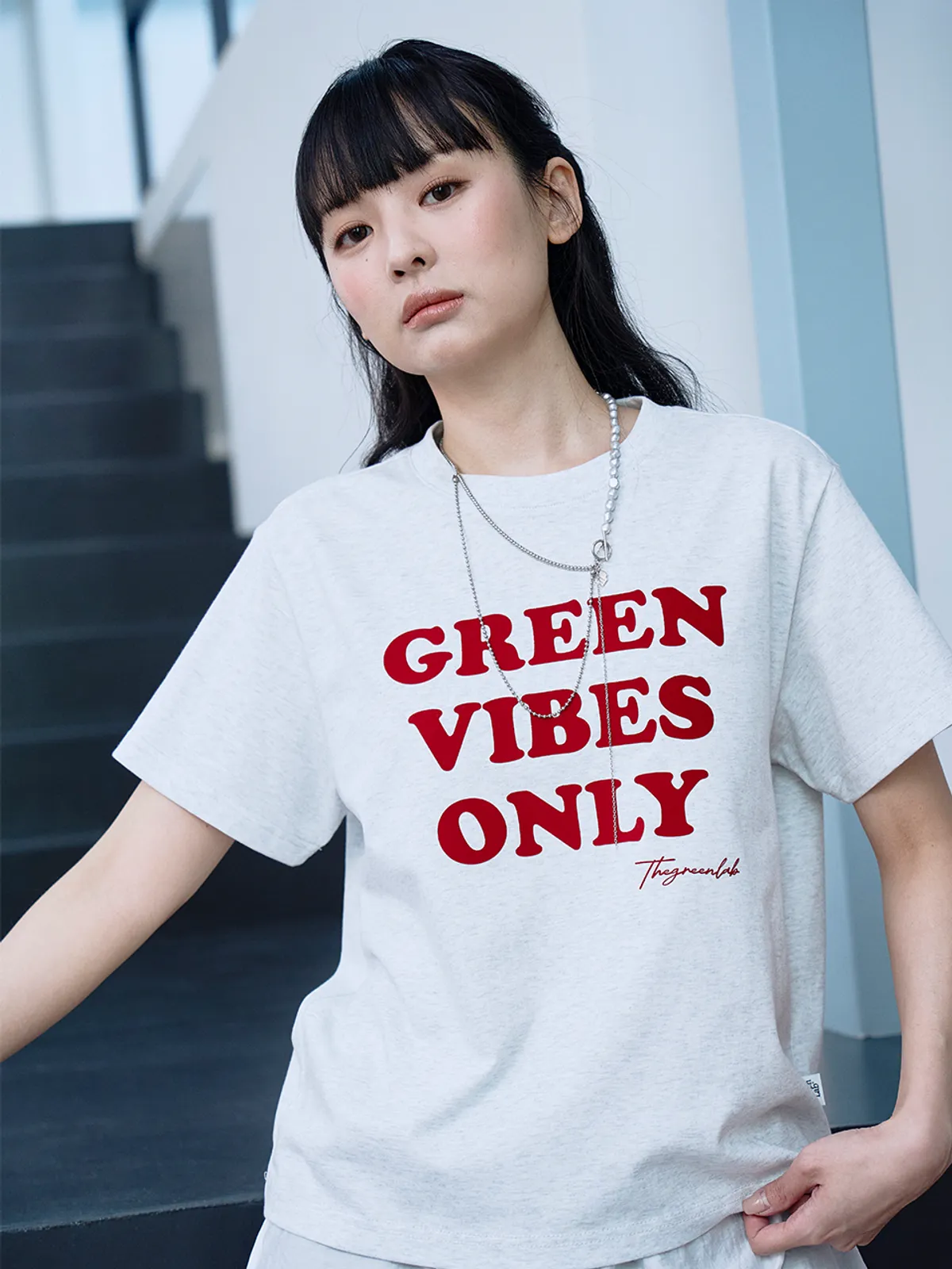 더그린랩_GREEN VIBES ONLY 텍스처 레터링 반팔 티셔츠 [Melange Grey]SALEMD