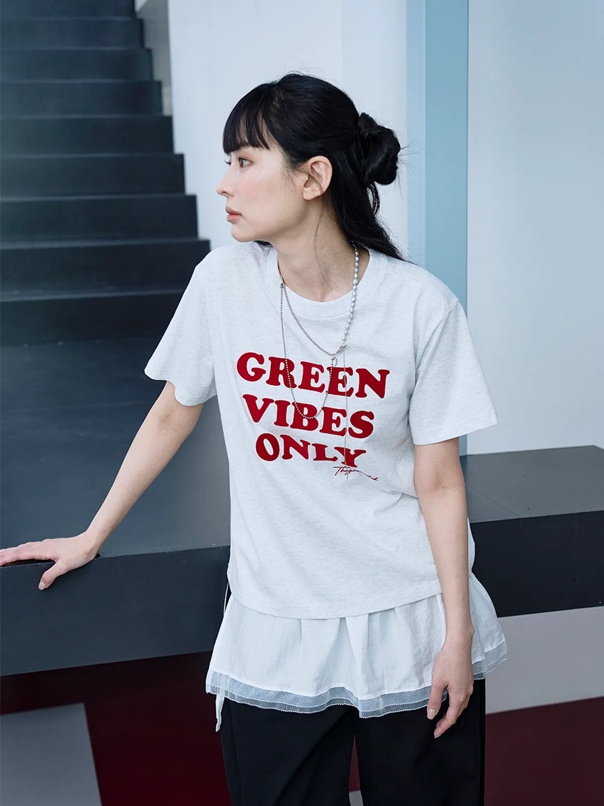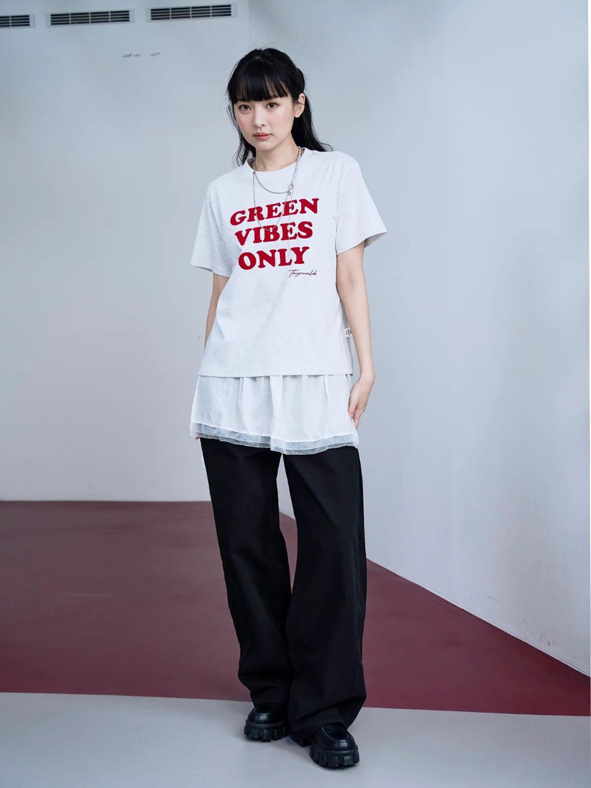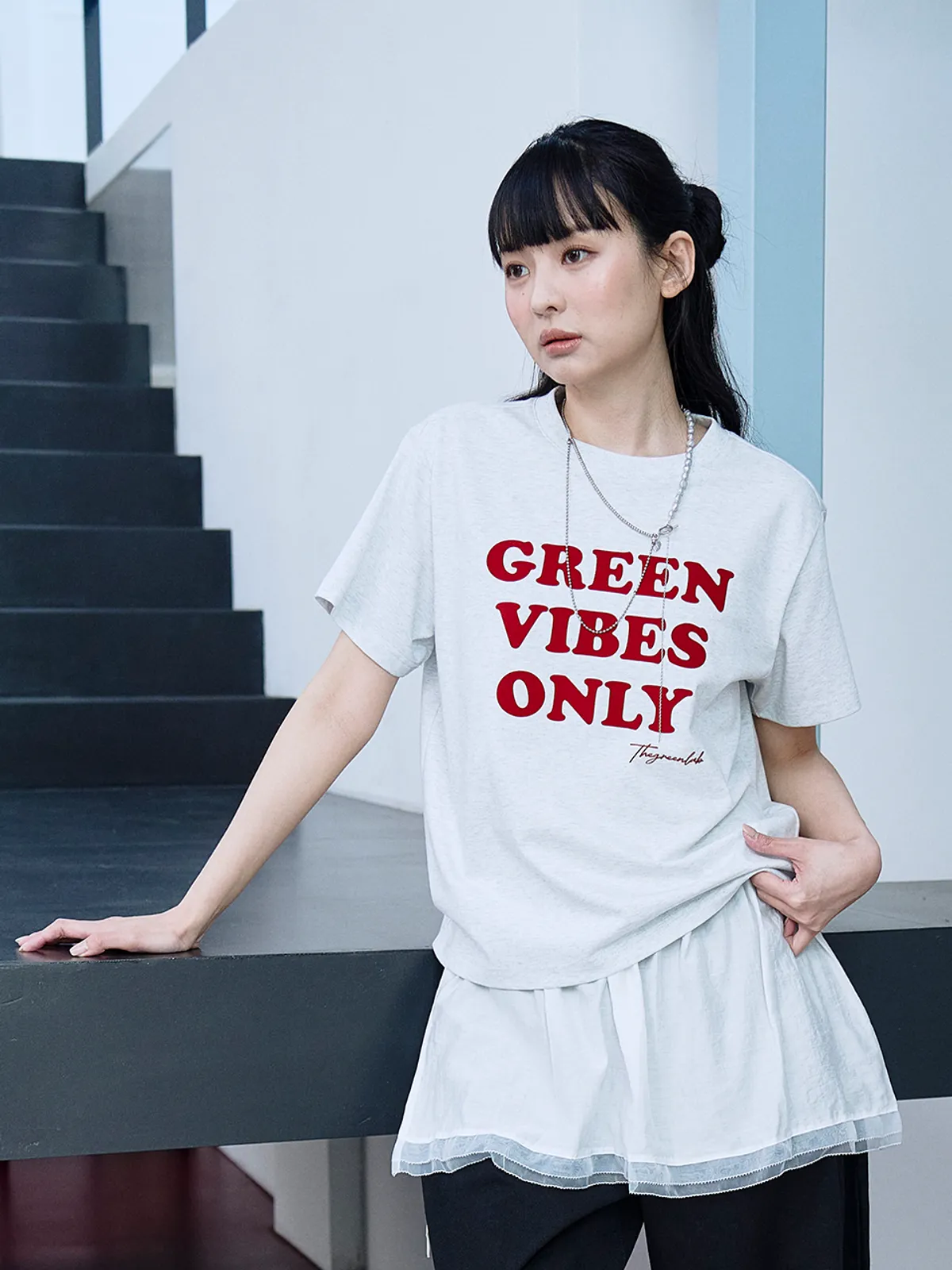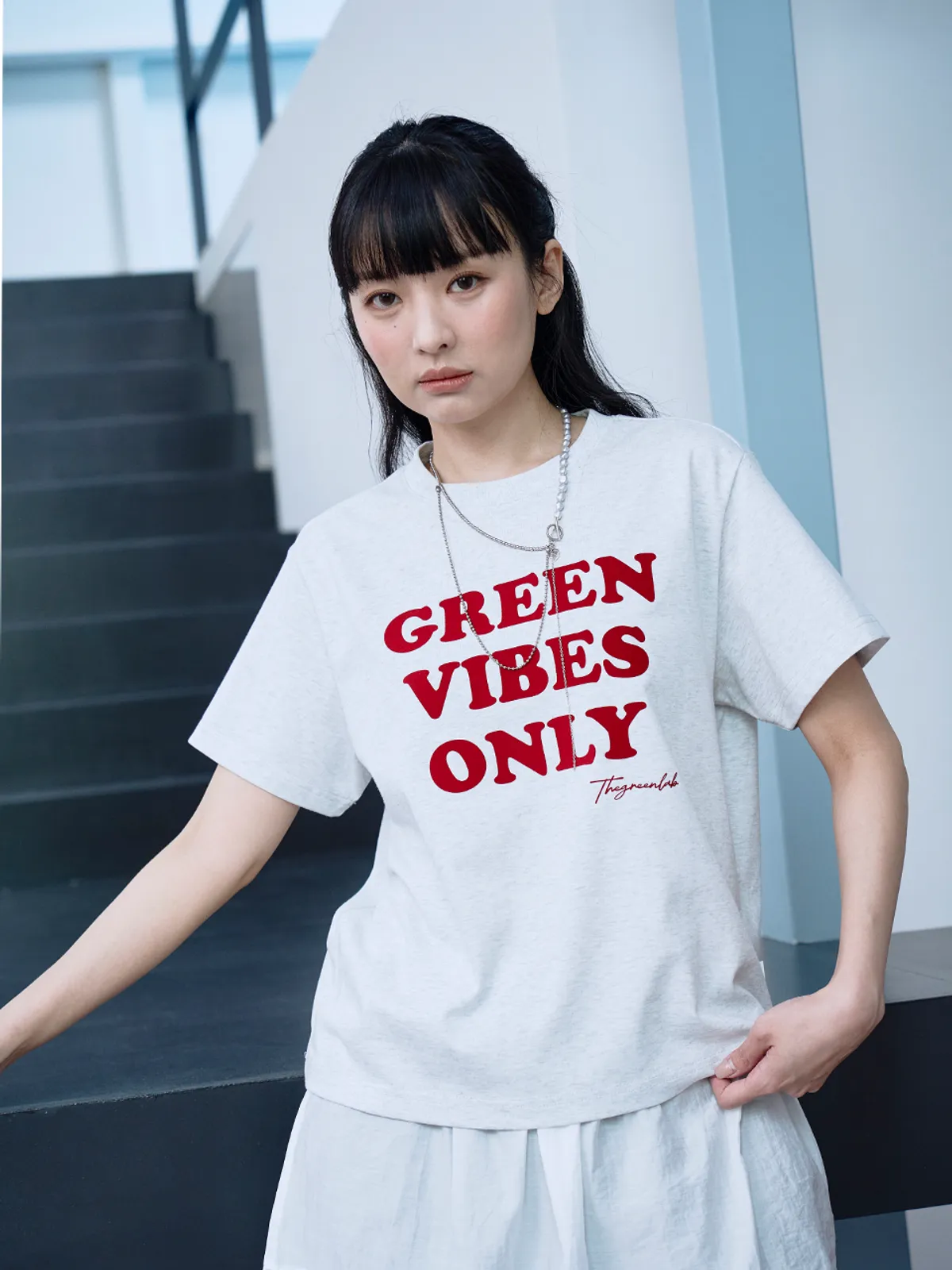 더그린랩_GREEN VIBES ONLY 텍스처 레터링 반팔 티셔츠 [Melange Grey]SALEMD
