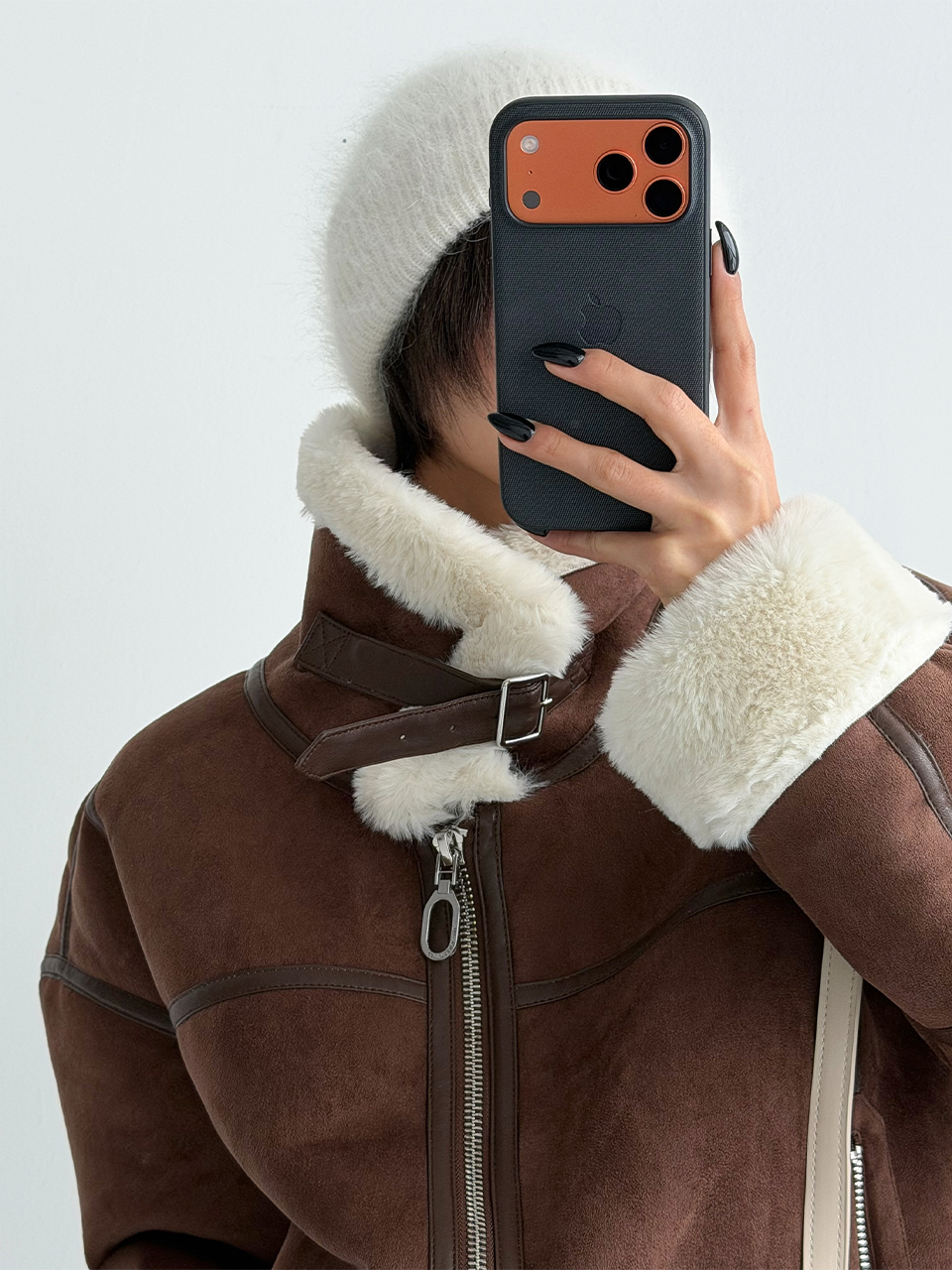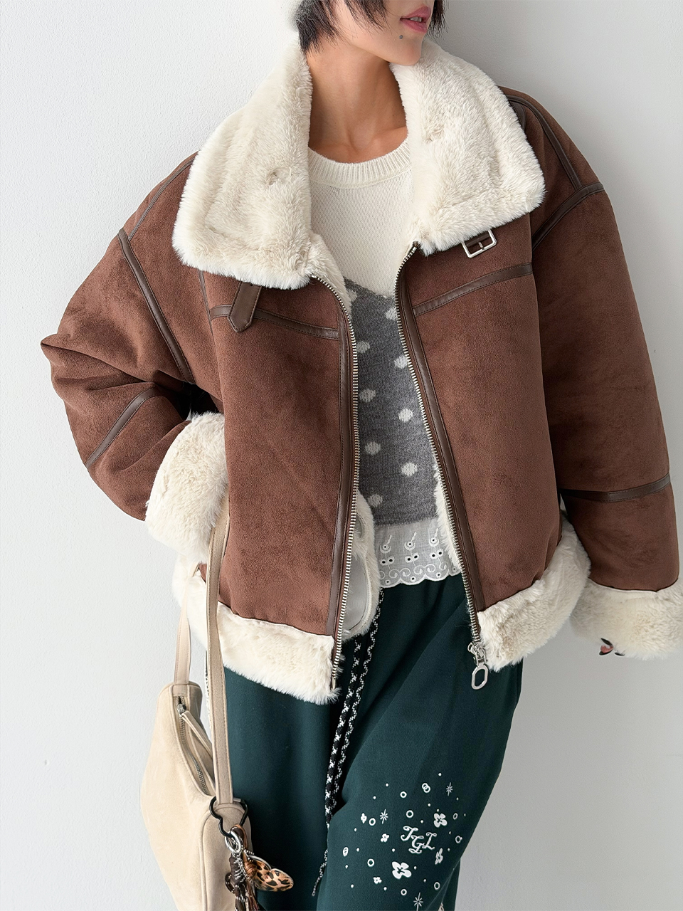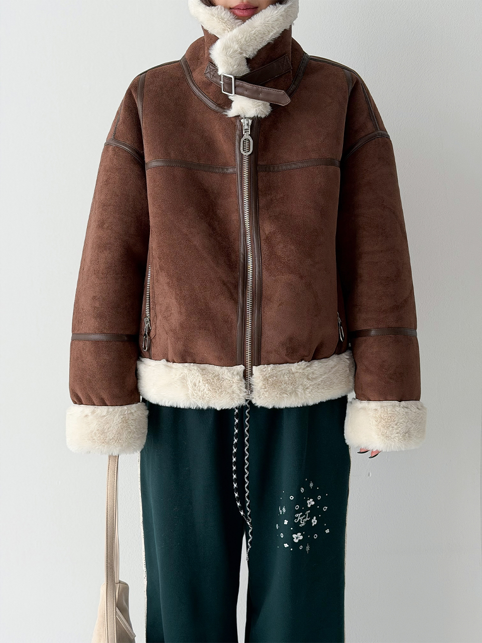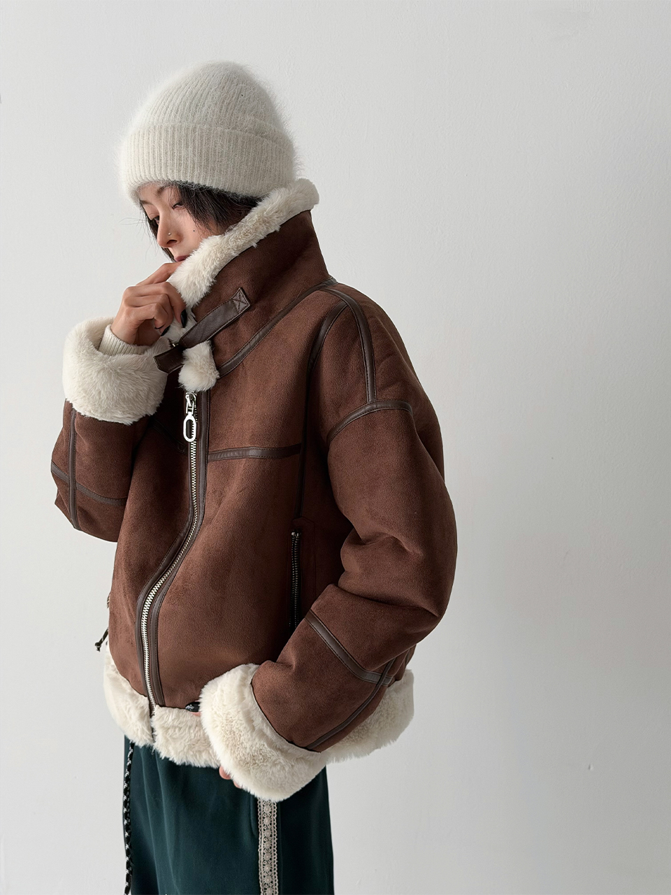 부드러운 스웨이드 겉감의 여유로운 무스탕 쟈켓