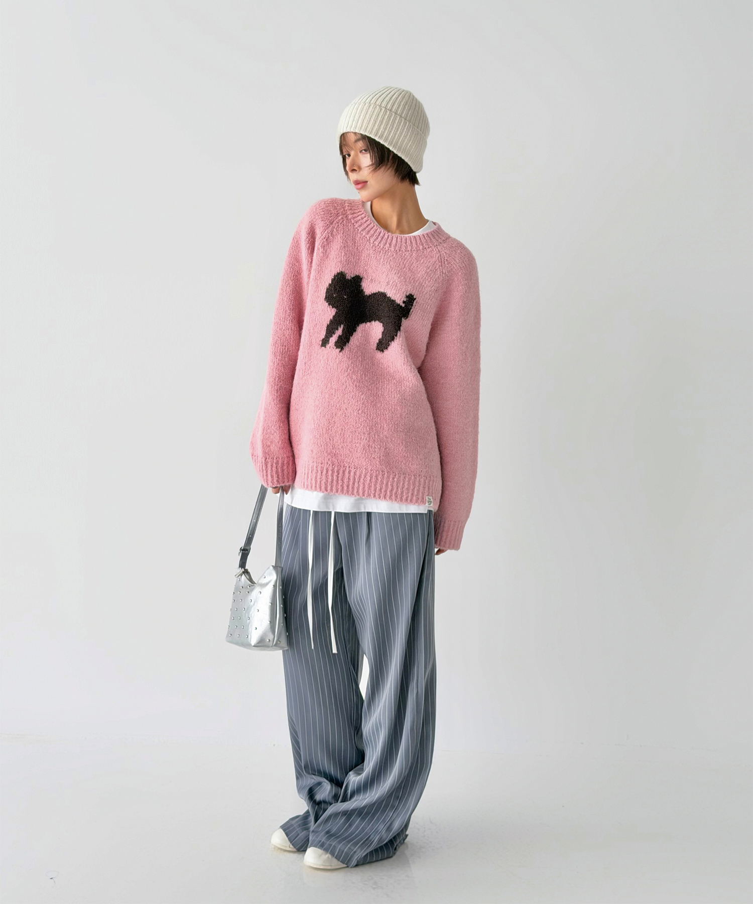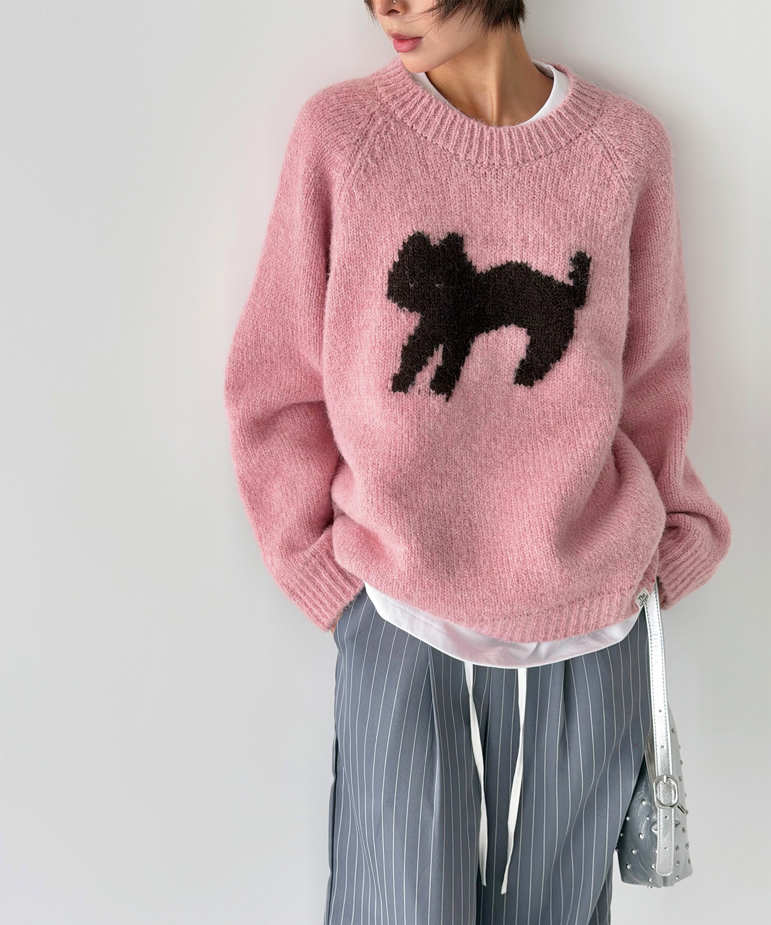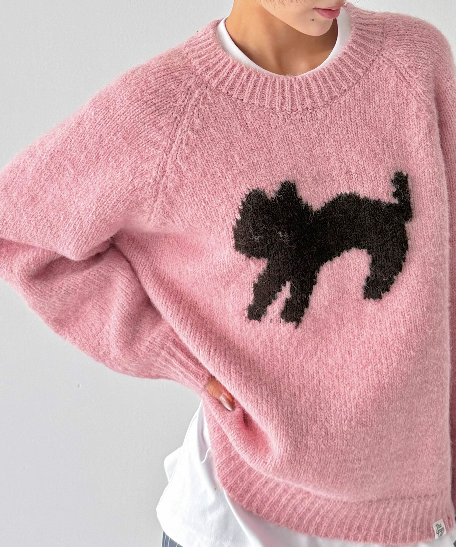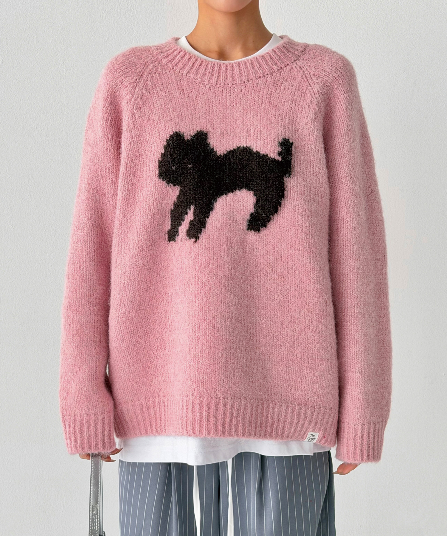 정면에 고양이 실루엣 자카드를 배치해 과하지 않게 포인트가 됩니다.