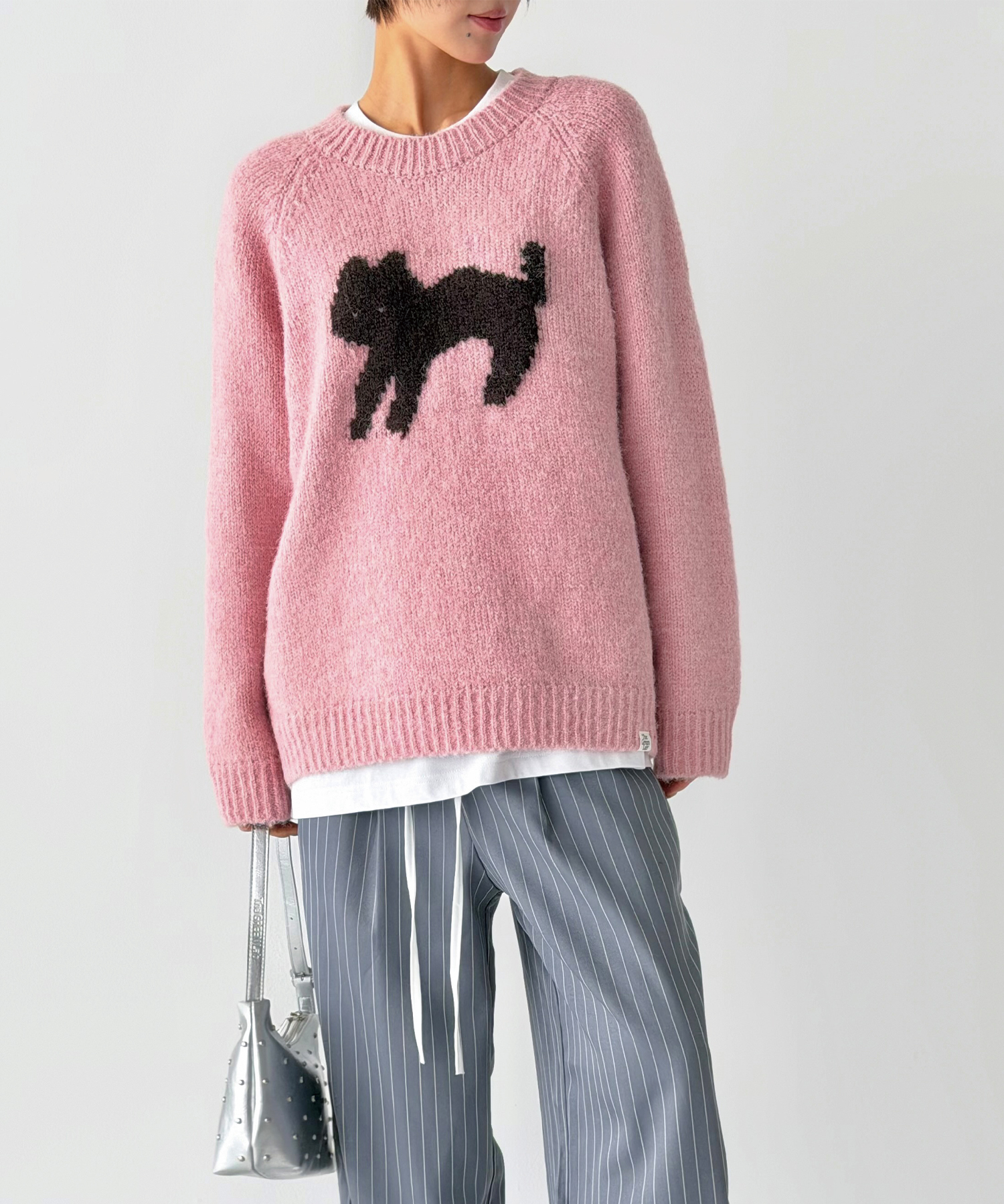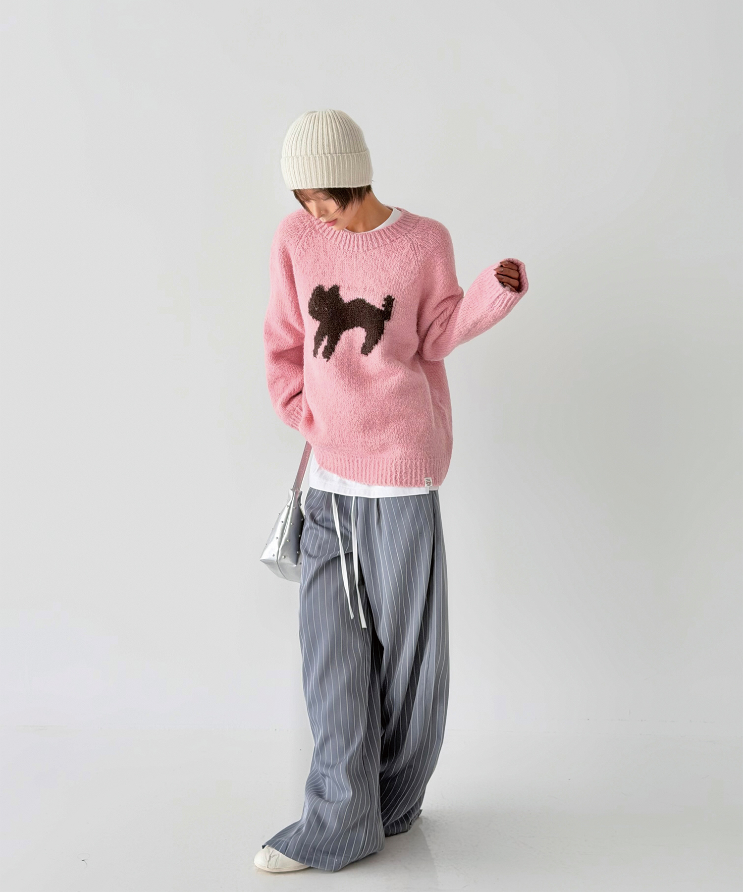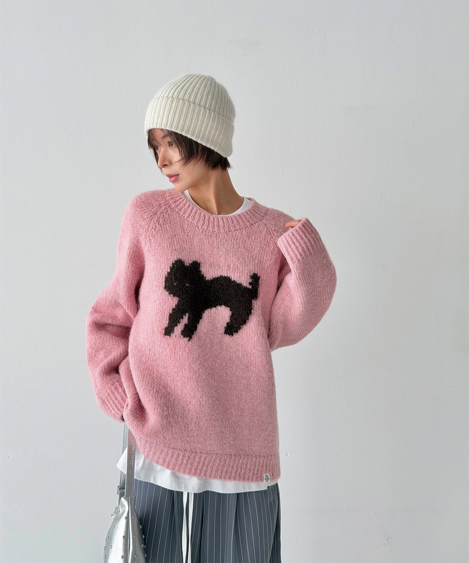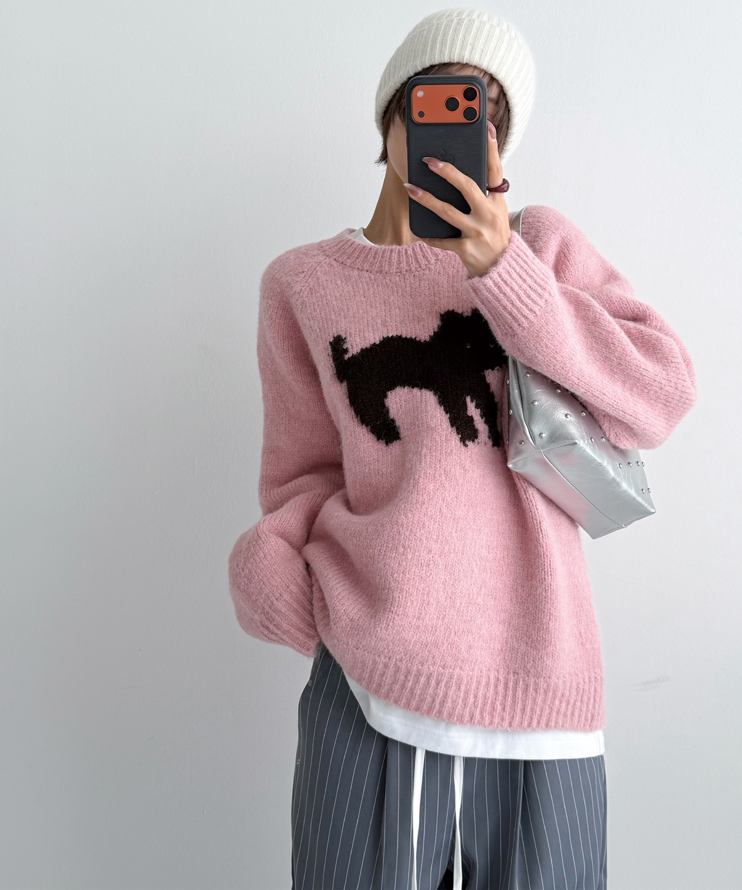 정면에 고양이 실루엣 자카드를 배치해 과하지 않게 포인트가 됩니다.