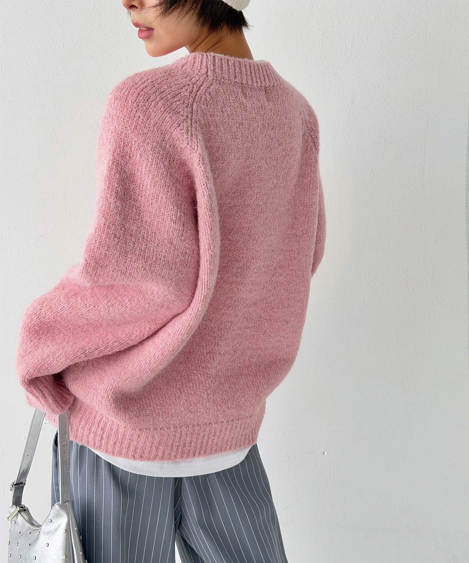 보송한 브러쉬 텍스처와 실의 결감이 은은하게 섞여 보이는 멜란지 톤의 원사로 편직해, 가볍게 걸쳐도 따뜻한 무드를 완성합니다.