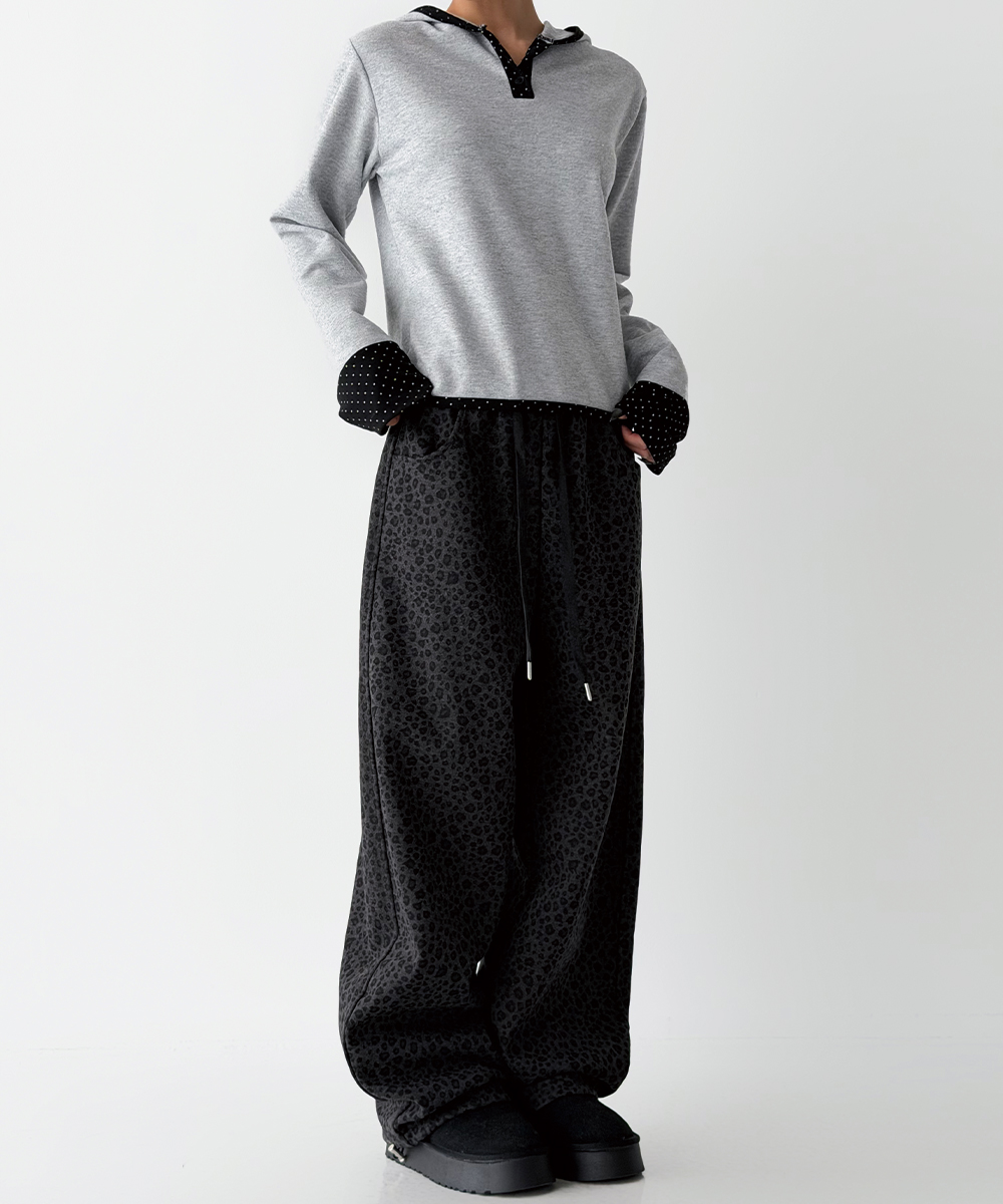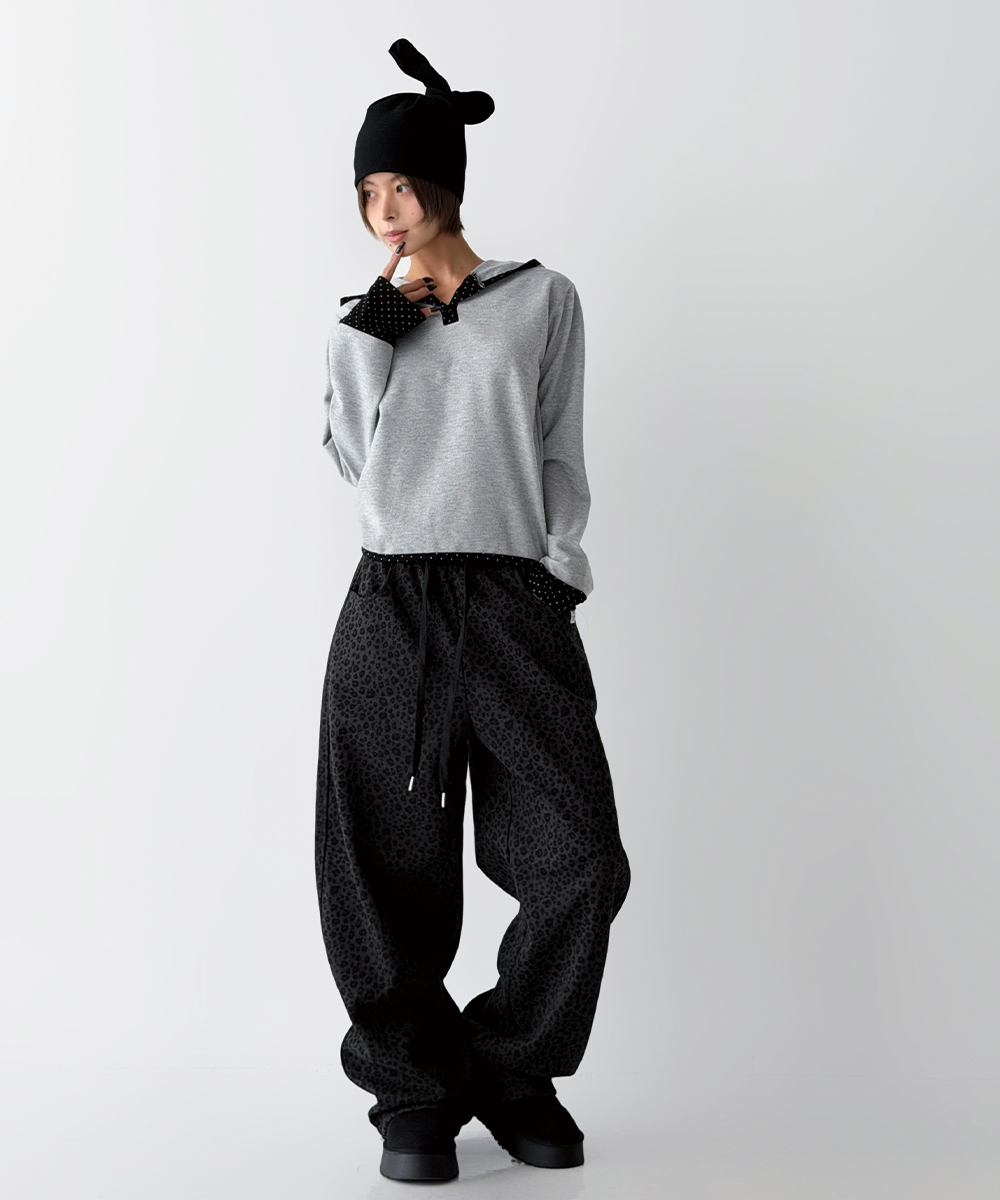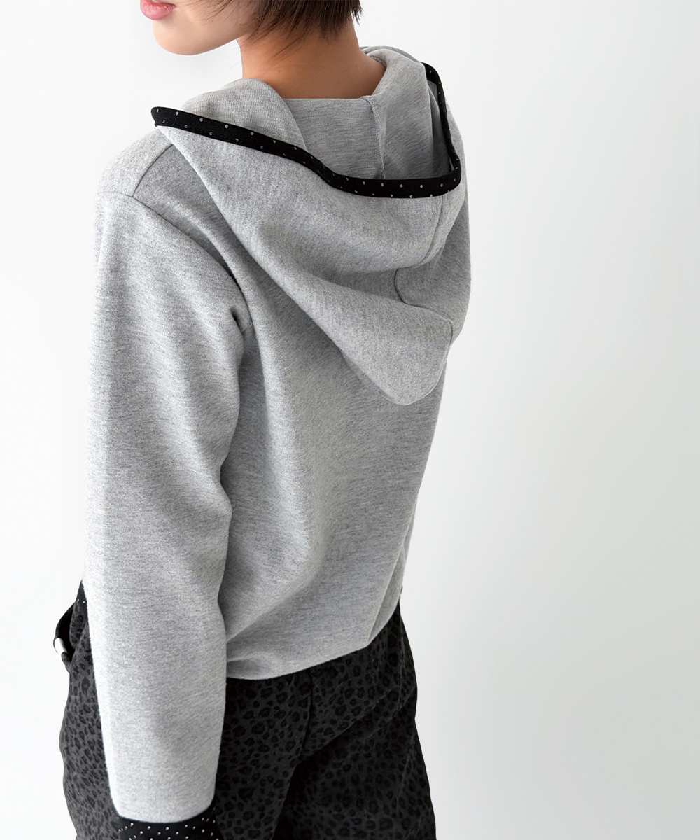 얼굴선을 포근하게 감싸는 후드와 소매 끝단·밑단의 도트 시보리는 입체적인 실루엣을 완성합니다.