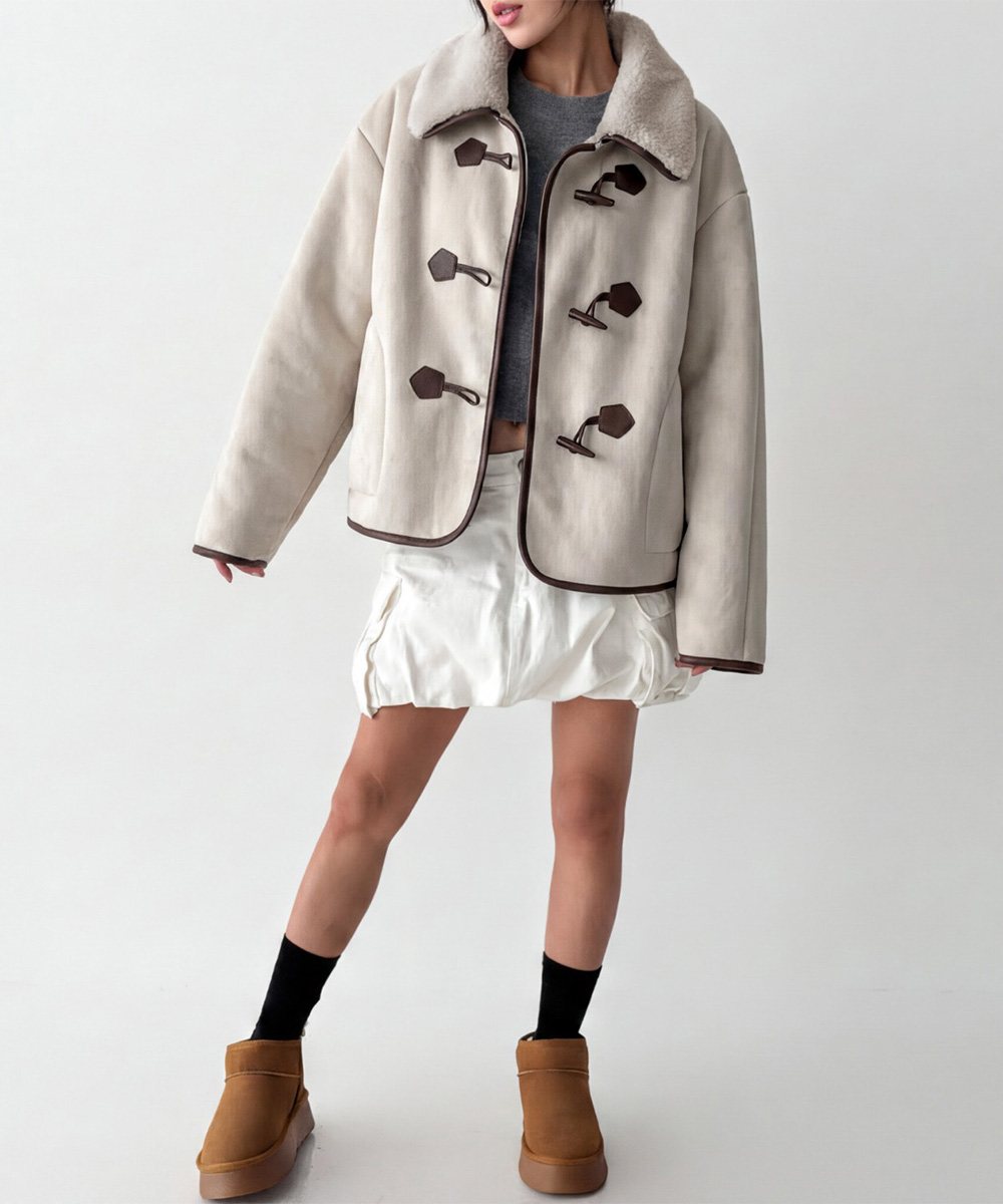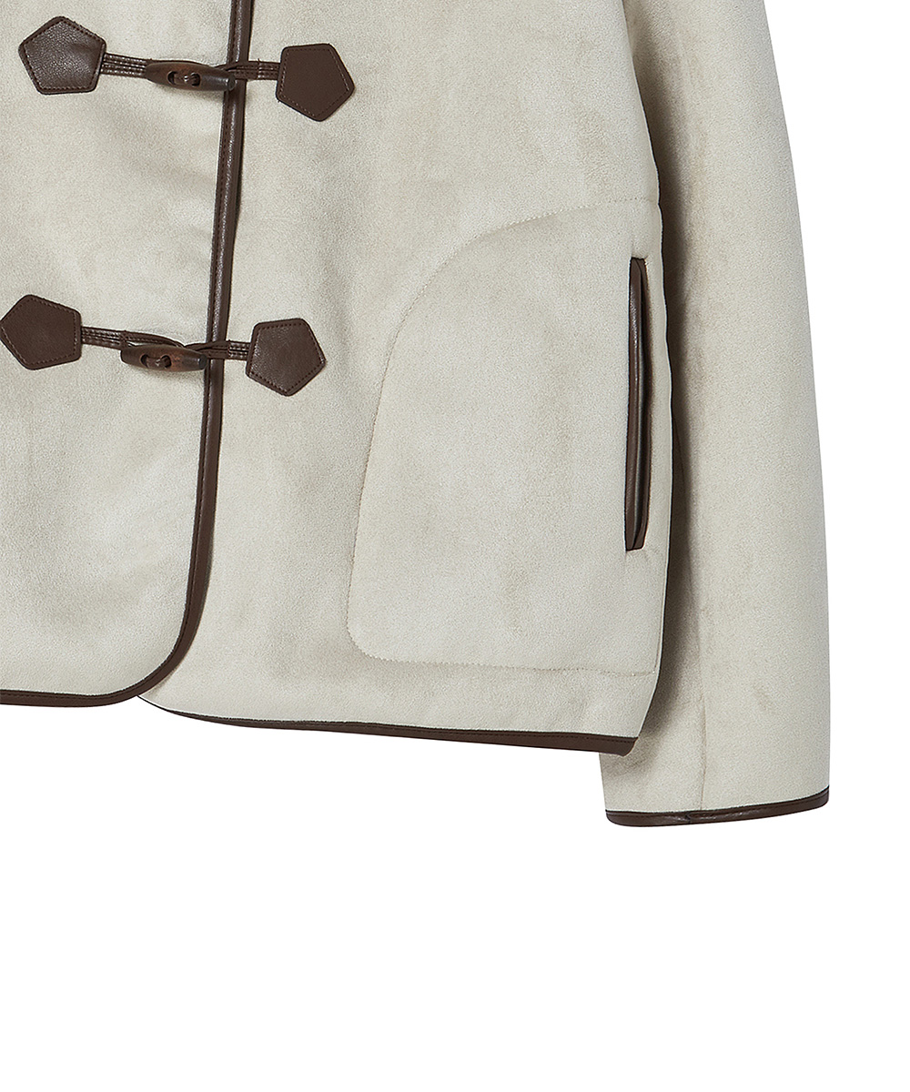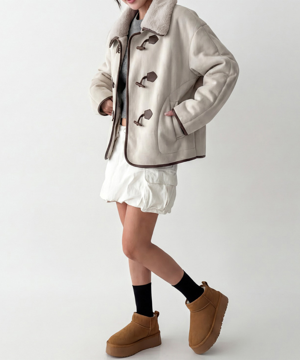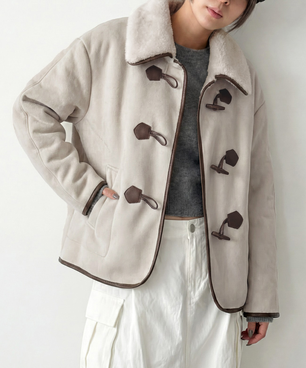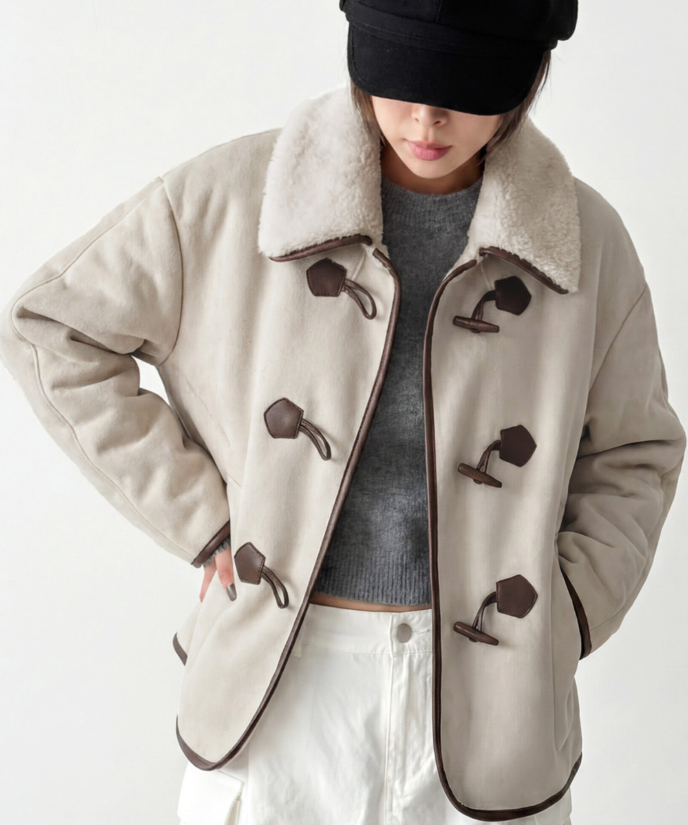 클래식한 토글 클로징과 배색 파이핑 디테일이 스웨이드 소재와 어우러져 캐주얼하면서도 세련된 무드를 완성합니다.