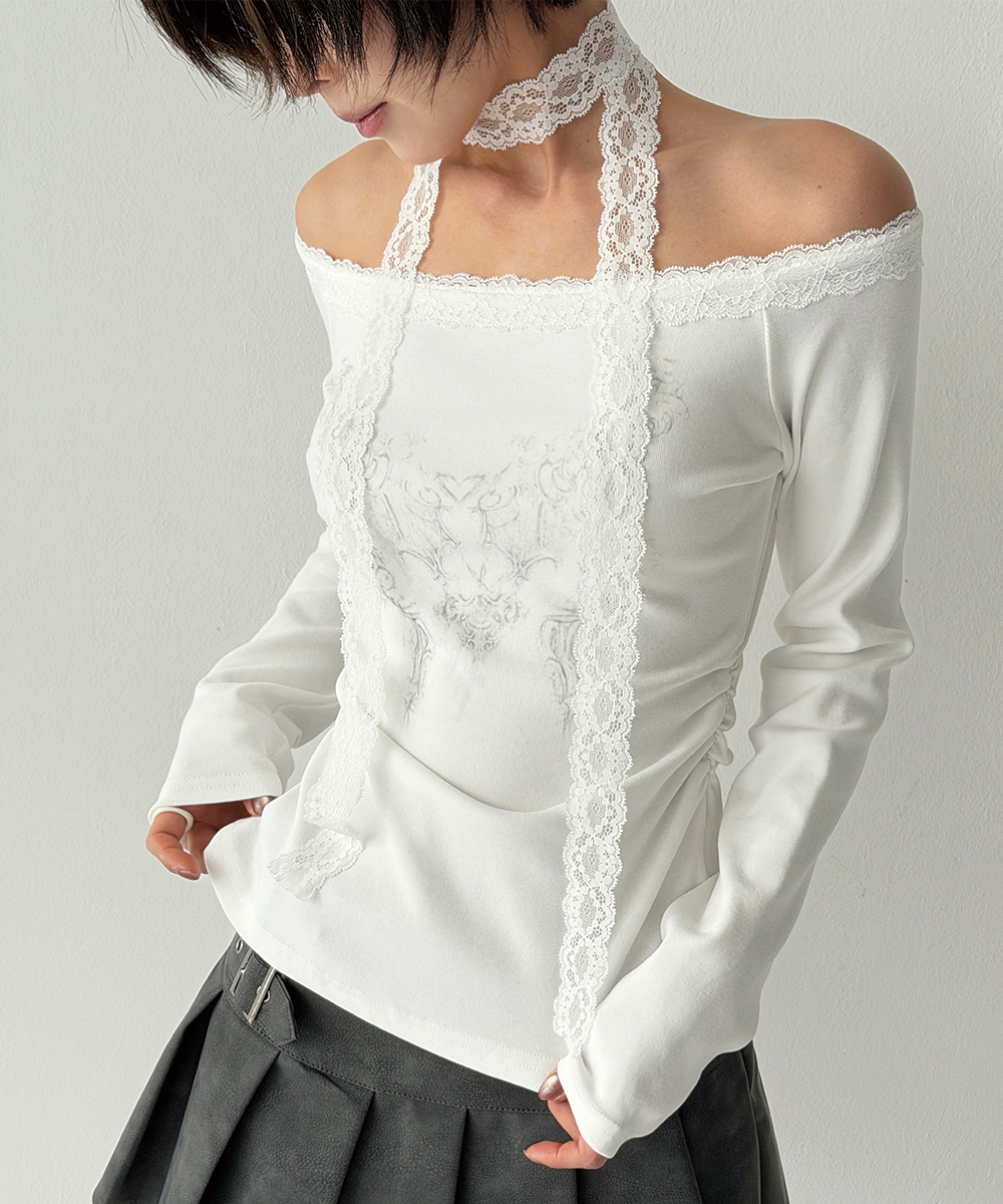 감각적인 그래픽과 섬세한 레이스 트리밍이 특징인 티셔츠입니다.