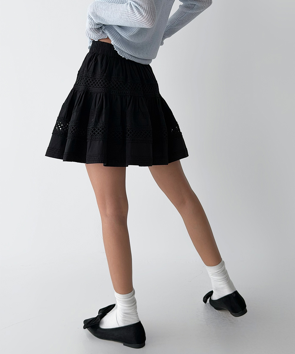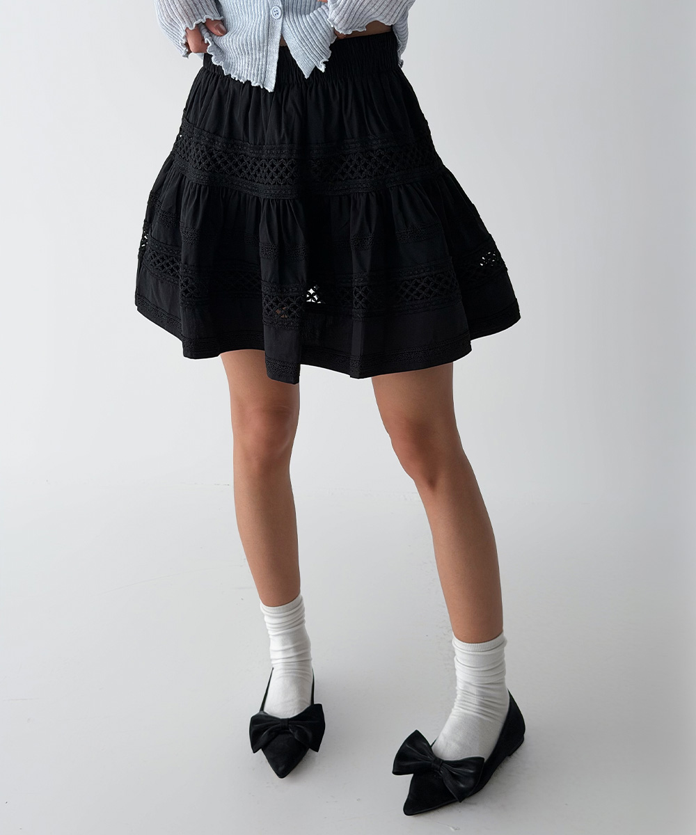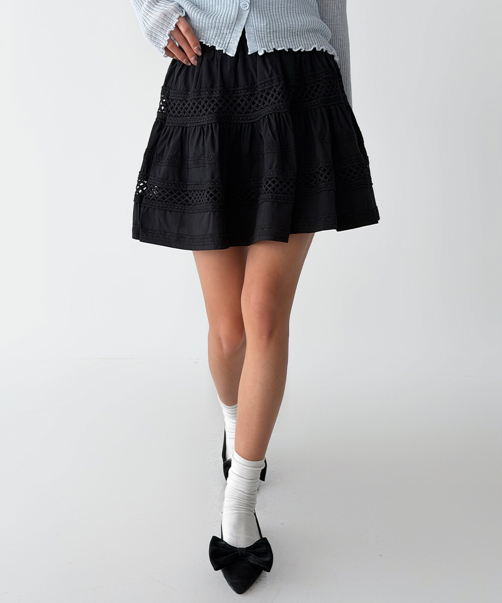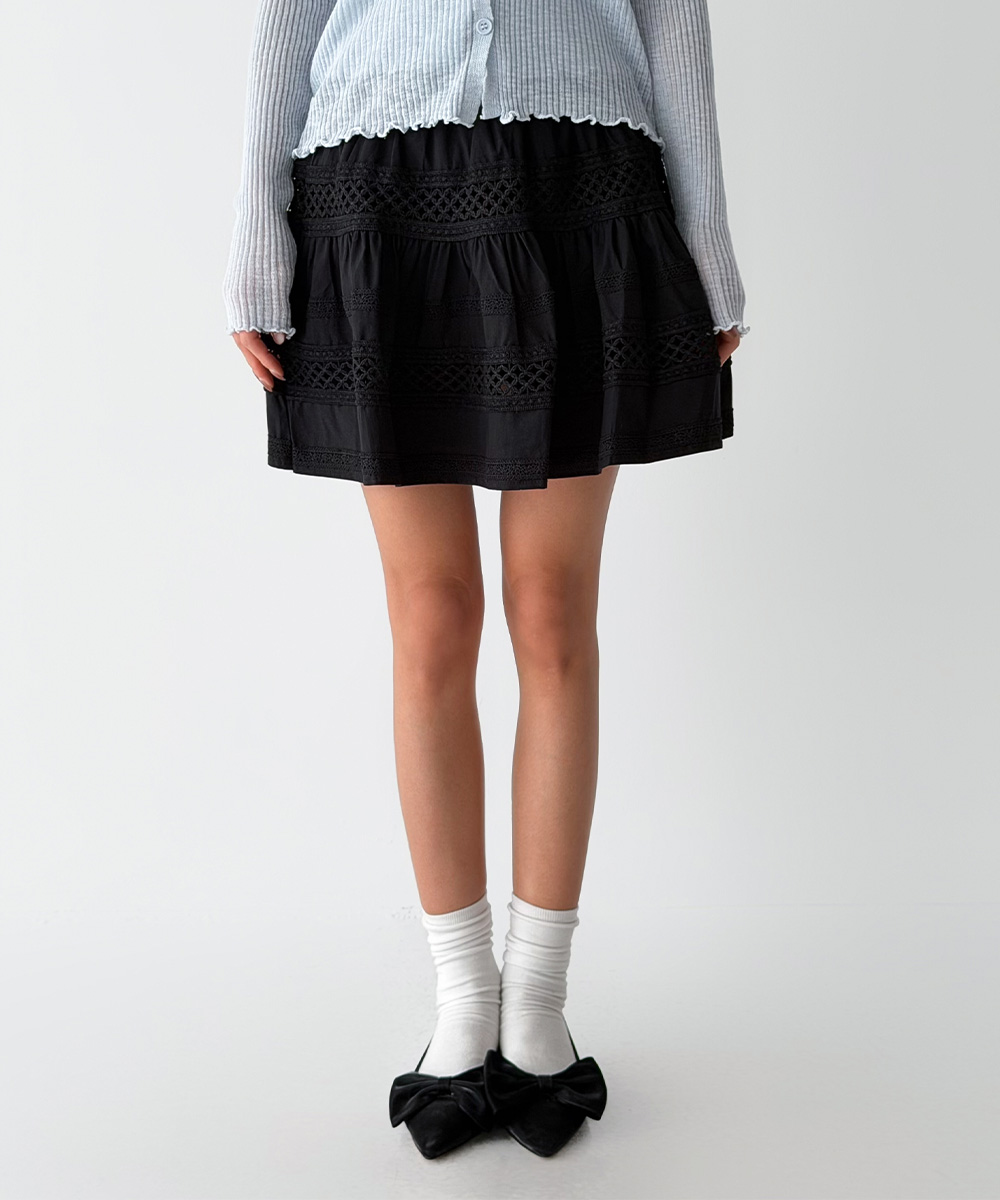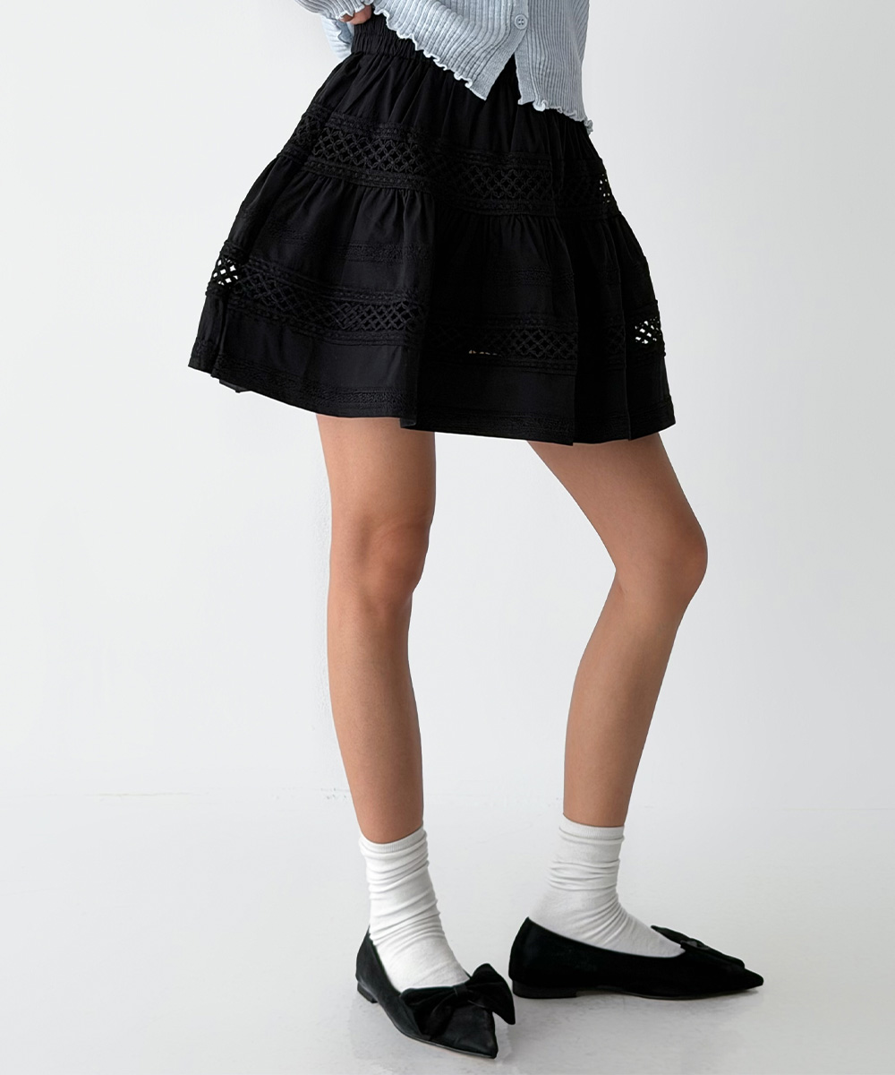 레이스 패널과 캉캉 디테일이 조화롭게 더해진 미니 기장 스커트로, 풍성한 실루엣과 러블리한 무드를 동시에 연출해줍니다.