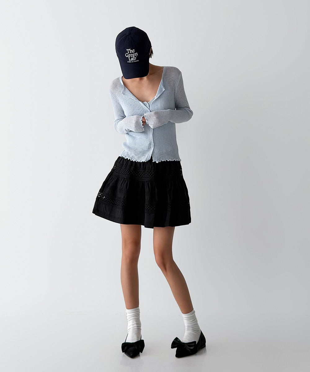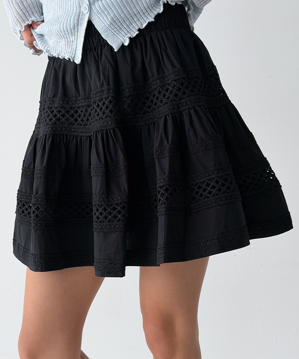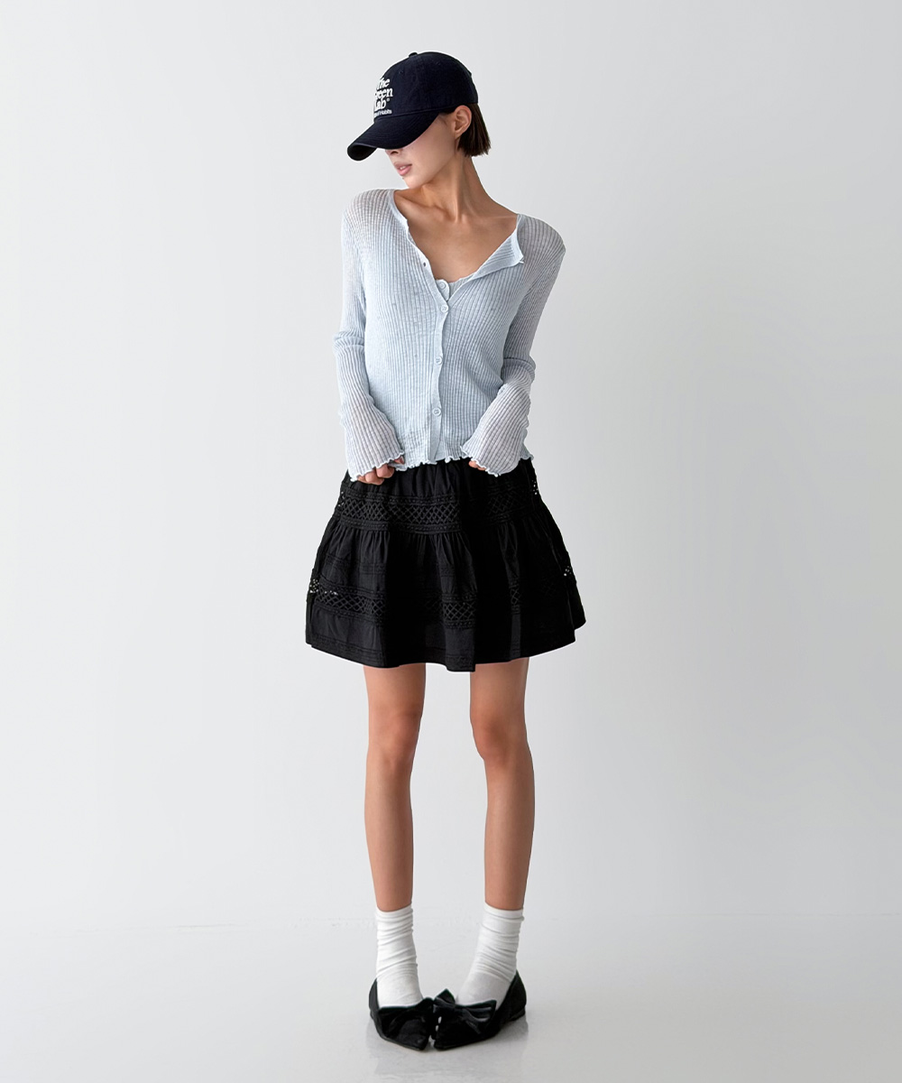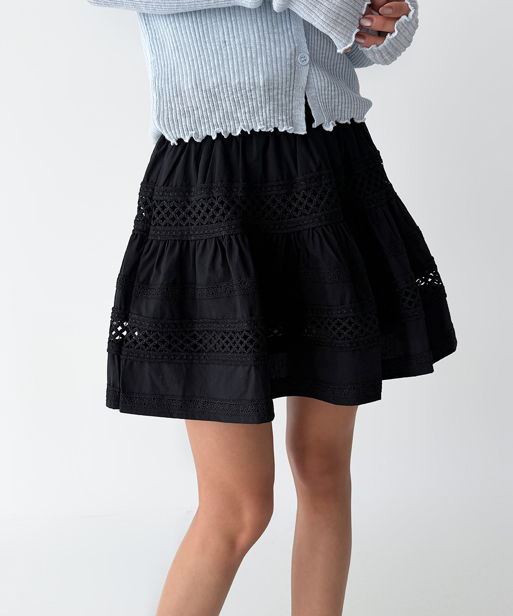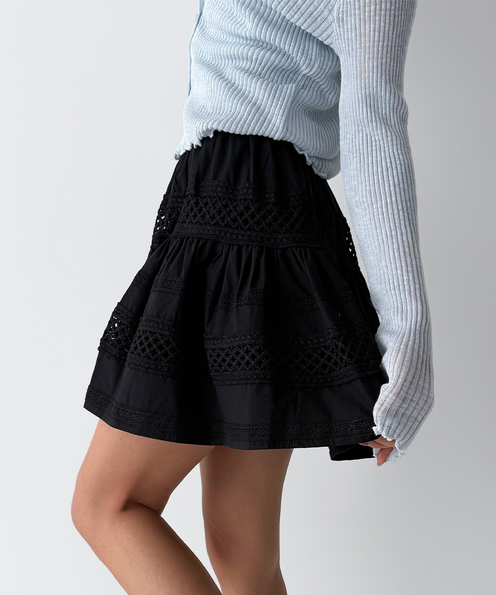 레이스 패널과 캉캉 디테일이 조화롭게 더해진 미니 기장 스커트로, 풍성한 실루엣과 러블리한 무드를 동시에 연출해줍니다.